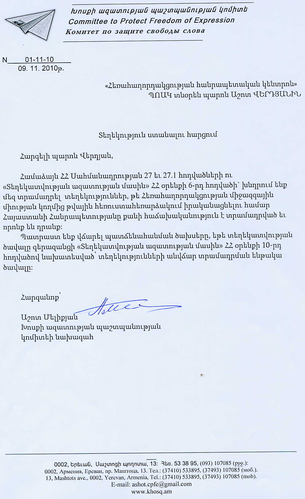 However, further developments showed that these allegations of the state officials did not correspond to reality. On September 15, 2010, we sent an official query to Nerses Yeritsyan, the Chairman of the Interdepartmental Commission on implementation of digital TV and Radio broadcasting in the territory of Armenia, RA Minister of Economy, with the request to provide the radio frequencies audit results. On September 28, the response was delivered. Signed by Deputy Minister Vahe Danielyan, it said that the draft of the final report on the audit was being discussed and after sum up of the results it would be presented to all the interested parties.